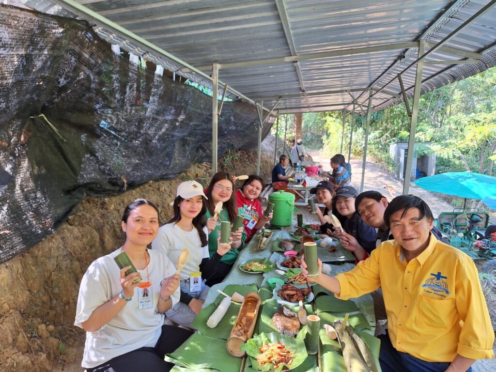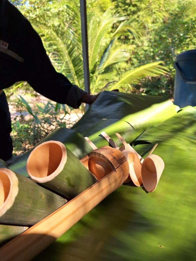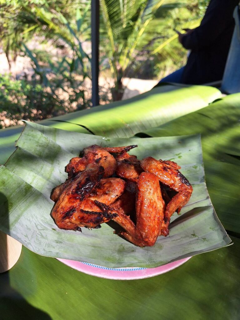 当你到达餐厅时,有一个小亭子,可以容纳20人。附近还有一个瀑布。你可以坐下来听瀑布的声音。除了美味的食物,你还可以享受周围的气氛。社区准备的食物是烤鸡沙拉。烤鸡是最好的。木瓜沙拉可以告诉照顾我们的人你想吃多少辣。或者你想吃一点也不辣他们都能做。还有香蕉鱼橙咖喱、烤鱼和香蕉叶包裹的糯米,装在竹筒里。还有一杯水和一勺竹筒制成的勺子。这是我第一次在这里看到它。最后但并非最不重要的一点是,对于那些想在大自然中放松身心或者如果你只是想改变吃饭气氛也可以。