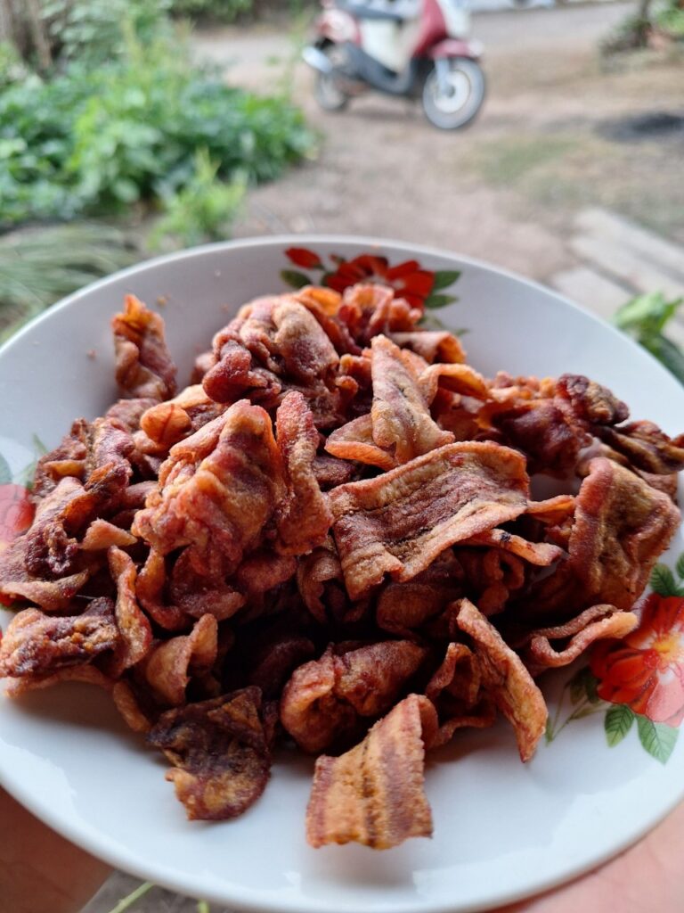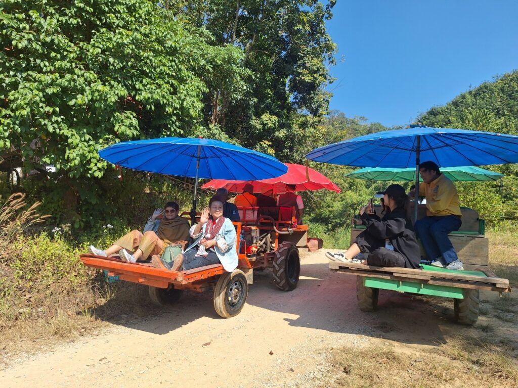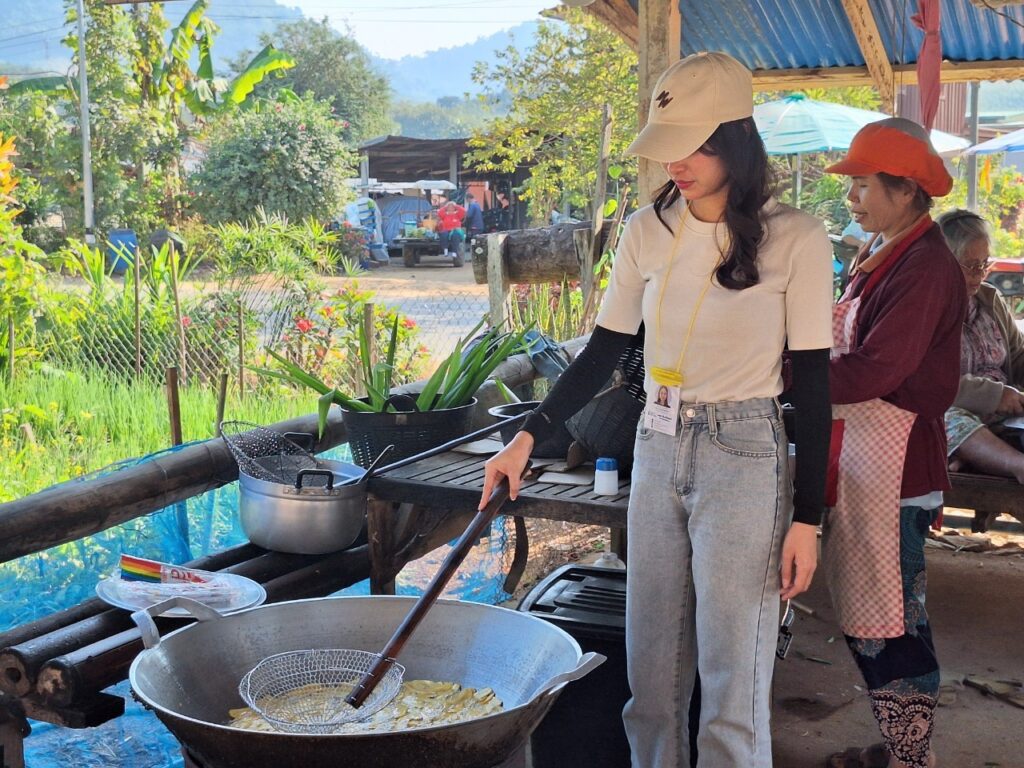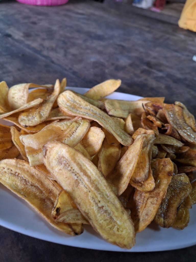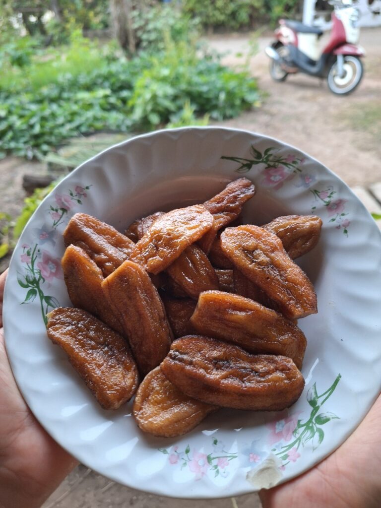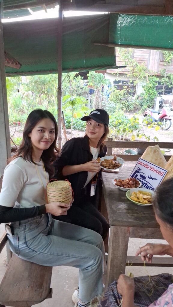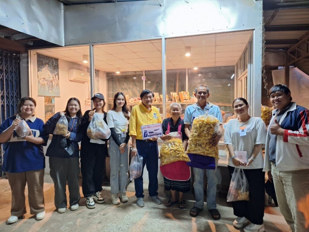 吃完饭后,我们乘坐E-Tak巴士返回。在返回的路上,我们有机会参观了当地的OTOP产品,即Mae Tom香蕉片。如果您参观Mae Tom的餐厅,您将看到新鲜制作的方法。餐厅只有两种口味:盐烤香蕉片和BreakTak香蕉片。而且价格也很实惠,小袋子每袋20泰铢,3袋50泰铢,大袋子每袋35泰铢,晒干香蕉35泰铢,来的人别忘了顺便来买Mae Tom香蕉片。
