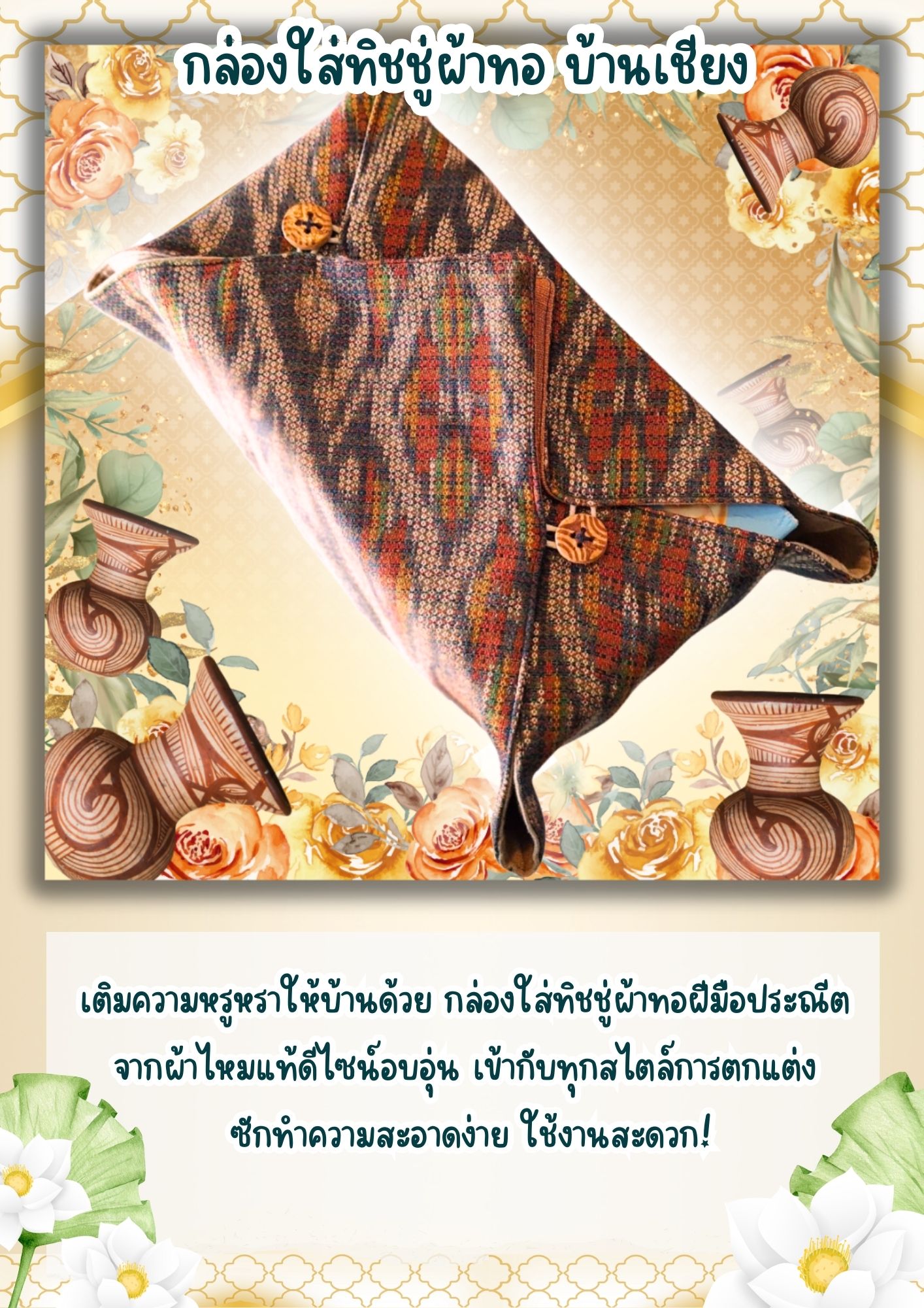 我们推荐 由优质棉布与真丝布料制成的手工纸巾盒,精选天然材料,融合泰式传统手工艺,不仅仅是日常用品,更为您的家居增添奢华与艺术气息。
