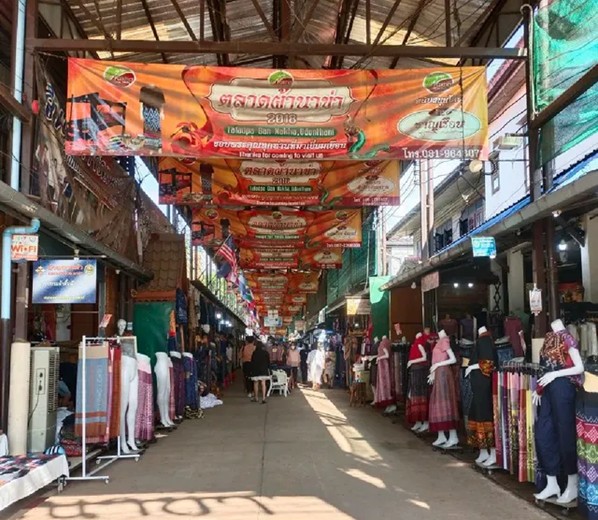 16:20 点, 到达Na Kha Market,Na Kha Market是一个集各种纪念品和礼品的中心,主要以不同种类的布料为特色,比如,丝绸、棉布、Khitcloth等,这些布料经过自然染色和手工制作,设计和裁剪由当地居民完成,展现出独特的图案,提供了丰富的布艺产品供人选择。例如衣服、裤子、成衣、披肩、围巾,甚至还有以米为单位出售的布料。这里有超过100家商店,是社区中一个强大的生产者群体,是东北地区最大、最全面的布艺商品购物市场。